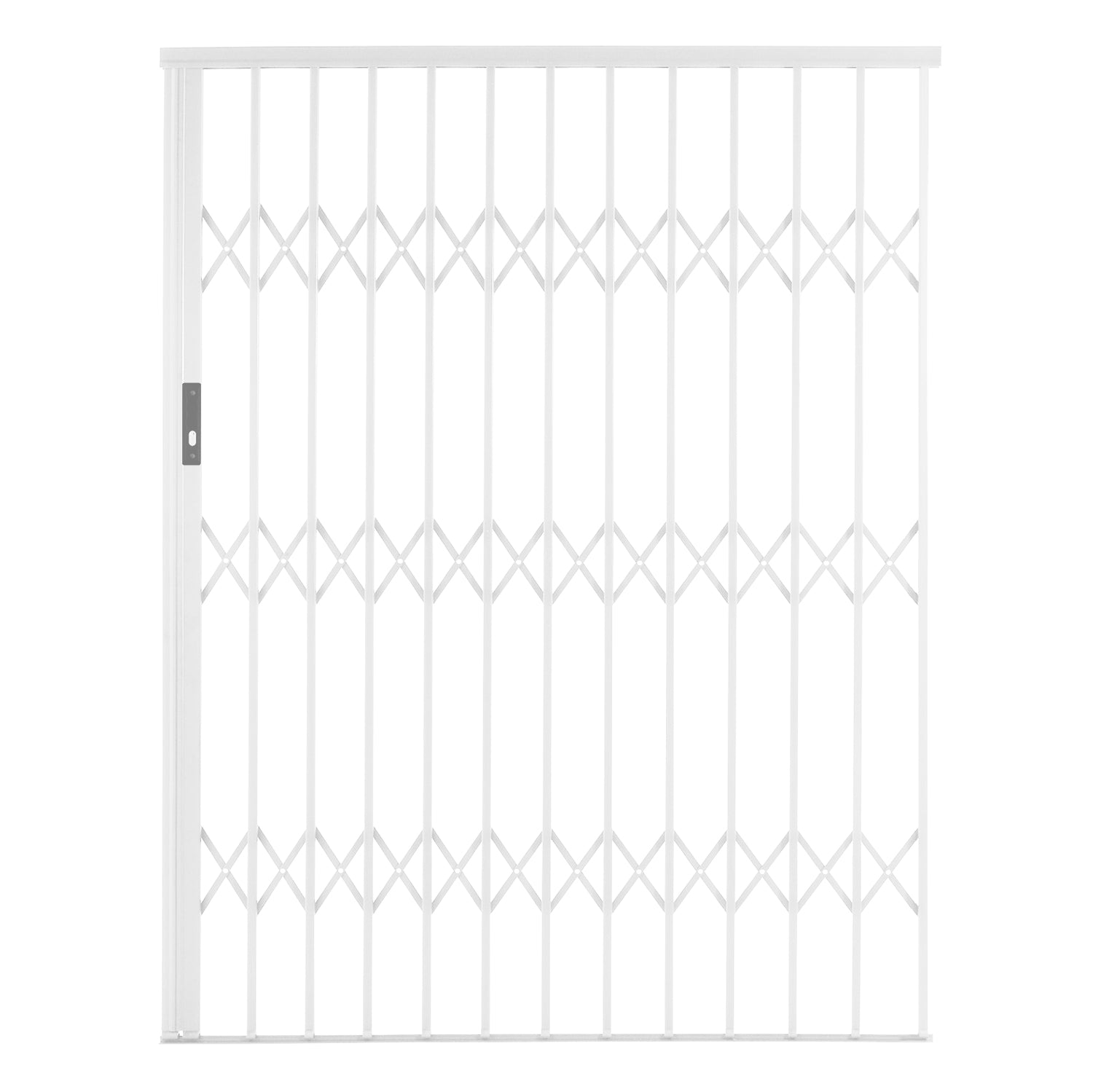 The Xpanda Alu-Glide slam lock security grille (1500mm, white) is constructed from 100% aluminum, offering excellent resistance to corrosion and versatility for multiple settings. This adjustable retractable security gate, measuring 1500mm wide by 2150mm high, features a durable powder-coated finish for enhanced longevity. It includes a slam lock for fast and reliable securing, along with top and bottom tracks, mounting hardware, and straightforward installation guidelines for hassle-free assembly.